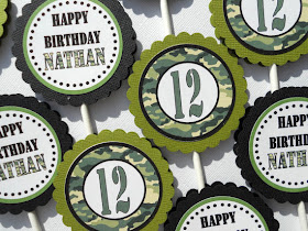 After deciding I wanted at least 40 toppers, and all of these are sold by the dozen, averaging about $11 per dozen (plus shipping), I decided to make my own. I have wanted a scalloped punch for a while, and I patiently waited for them to go on sale at Hobby Lobby. They finally did, and I bought one for about $12. As far as the other supplies I used - I bought a package of miniature wood stakes (like a bulky toothpick) and some camouflage scrapbook paper. I already had some neutral-colored cardstock and a hot glue gun. They turned out pretty simple, but I like them.