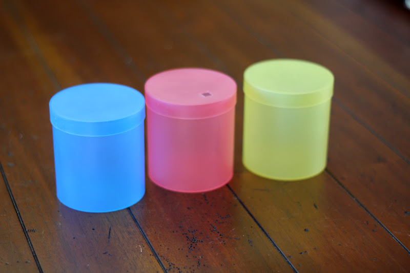 I bought a value bag of assorted sizes of the pom poms - There's no way we will use them all for this but I am currently stringing them up to make some colorful garlands (we have a lot of birthdays to celebrate in February and March) . I made 3 containers, with different sized holes in each one for the 3 sizes of pom poms. Purely out of vanity (if we're being honest), I wanted something a little cuter than Rubbermaid Take-n-Toss - and I found these containers for 99 cents each around the corner from the pom poms, so I snatched them up. They were made of heavier plastic so my box cutter wouldn't cut strait (cute) lines, but they work.